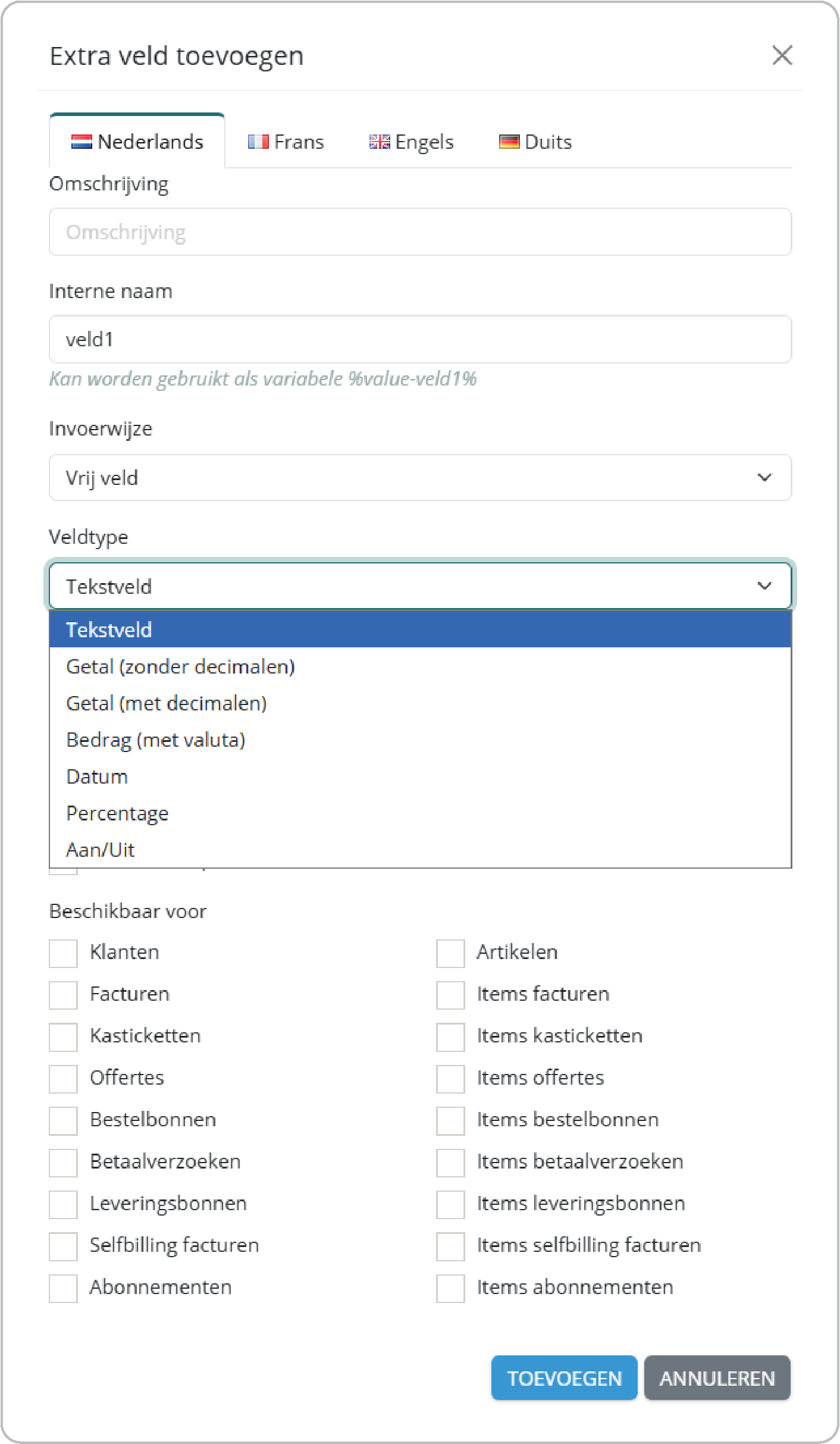 Je kan voortaan niet alleen tekst, maar ook andere veldtypes toevoegen als extra veld. Daarnaast kan je een extra veld gebruiken als berekeningsveld op je factuur én er een standaardwaarde aan koppelen.