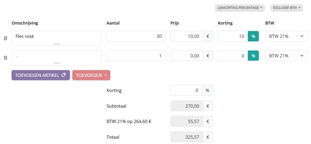 Je kan nu een lijnkorting in percentage toepassen. Hierbij geef je per factuurlijn een procentuele korting in, die automatisch wordt verrekend in het lijntotaal.