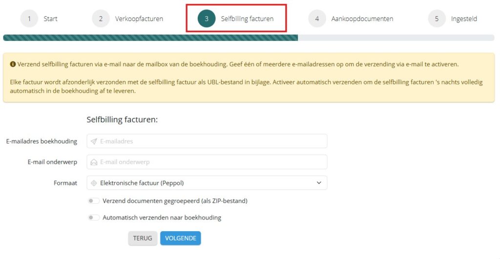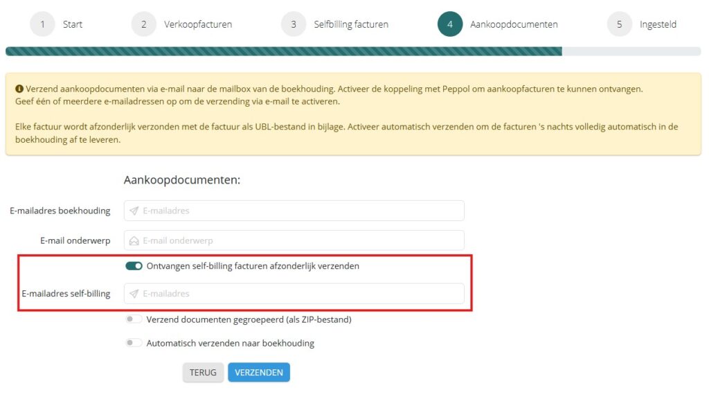 Voor ontvangen self-billing facturen die je afzonderlijk wil laten doorsturen naar de boekhouding, activeer je de optie “Ontvangen self-billing facturen afzonderlijk verzenden” bij stap 4. Vervolgens geef je het specifieke e-mailadres in bij “E-mailadres self-billing”.