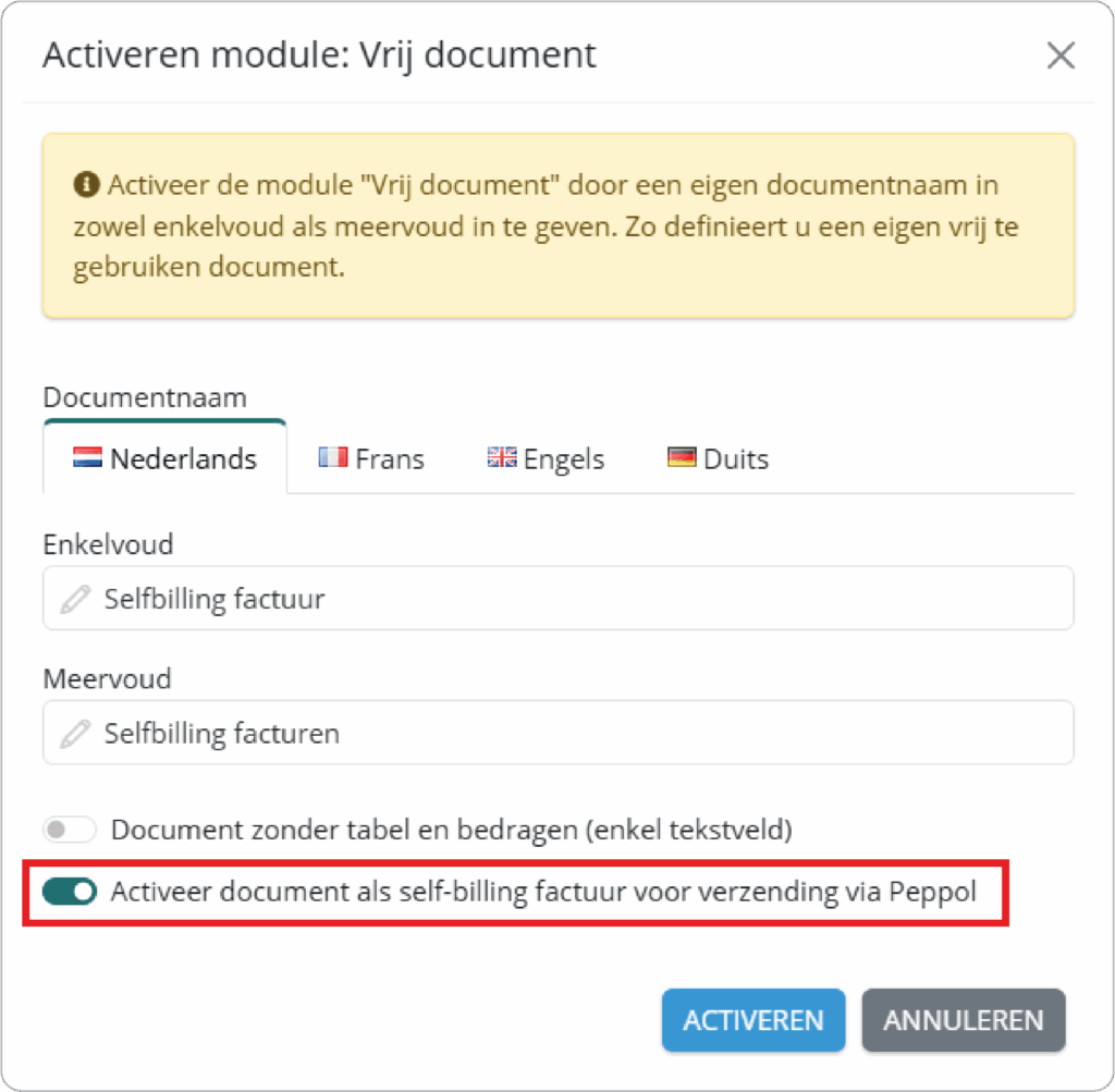 Na het inschakelen wordt het document automatisch als self-billing factuur verwerkt wanneer je het via Peppol verstuurt.