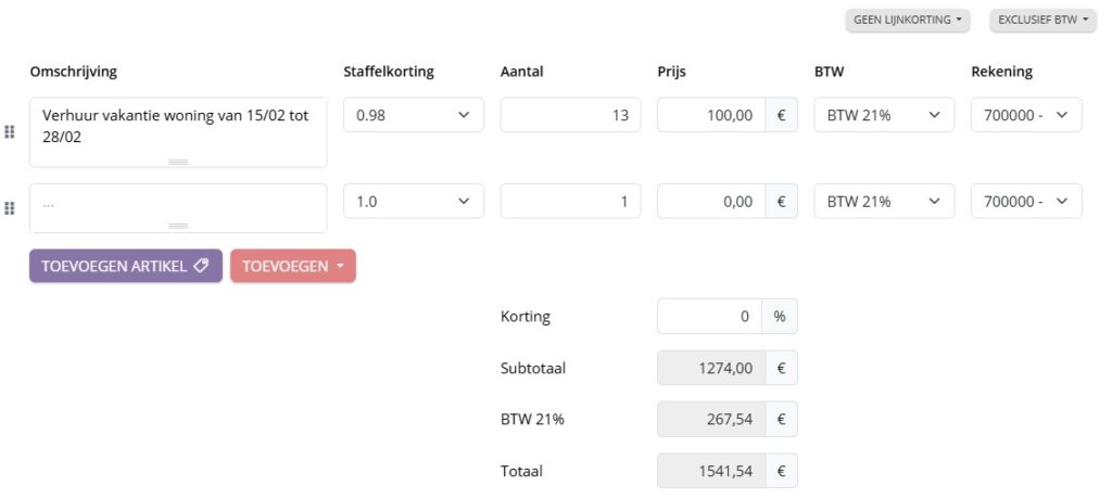Bij het opmaken van de factuur kies je de juiste staffel. Het systeem vermenigvuldigt automatisch het subtotaal met de gekozen factor, waardoor de korting correct wordt toegepast.